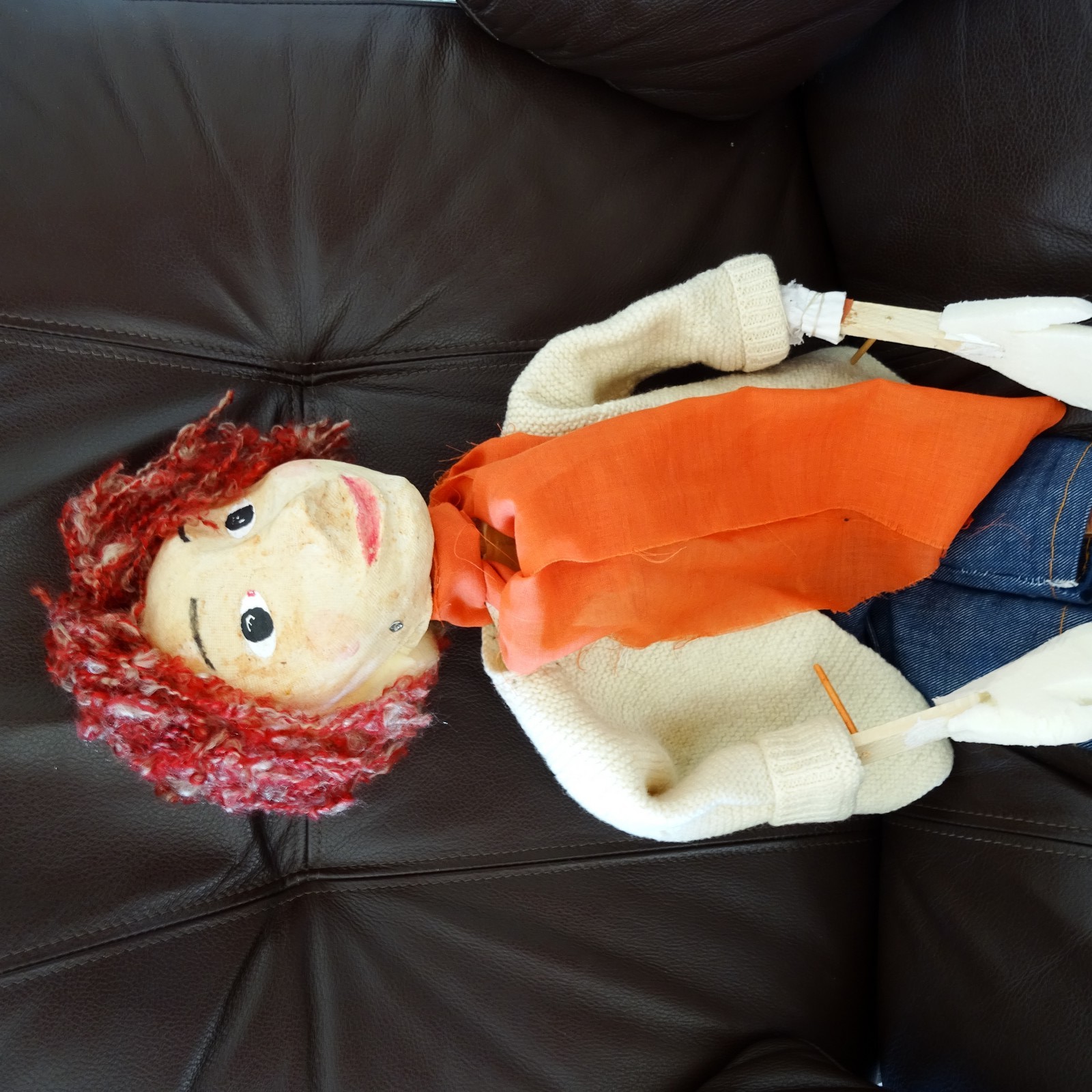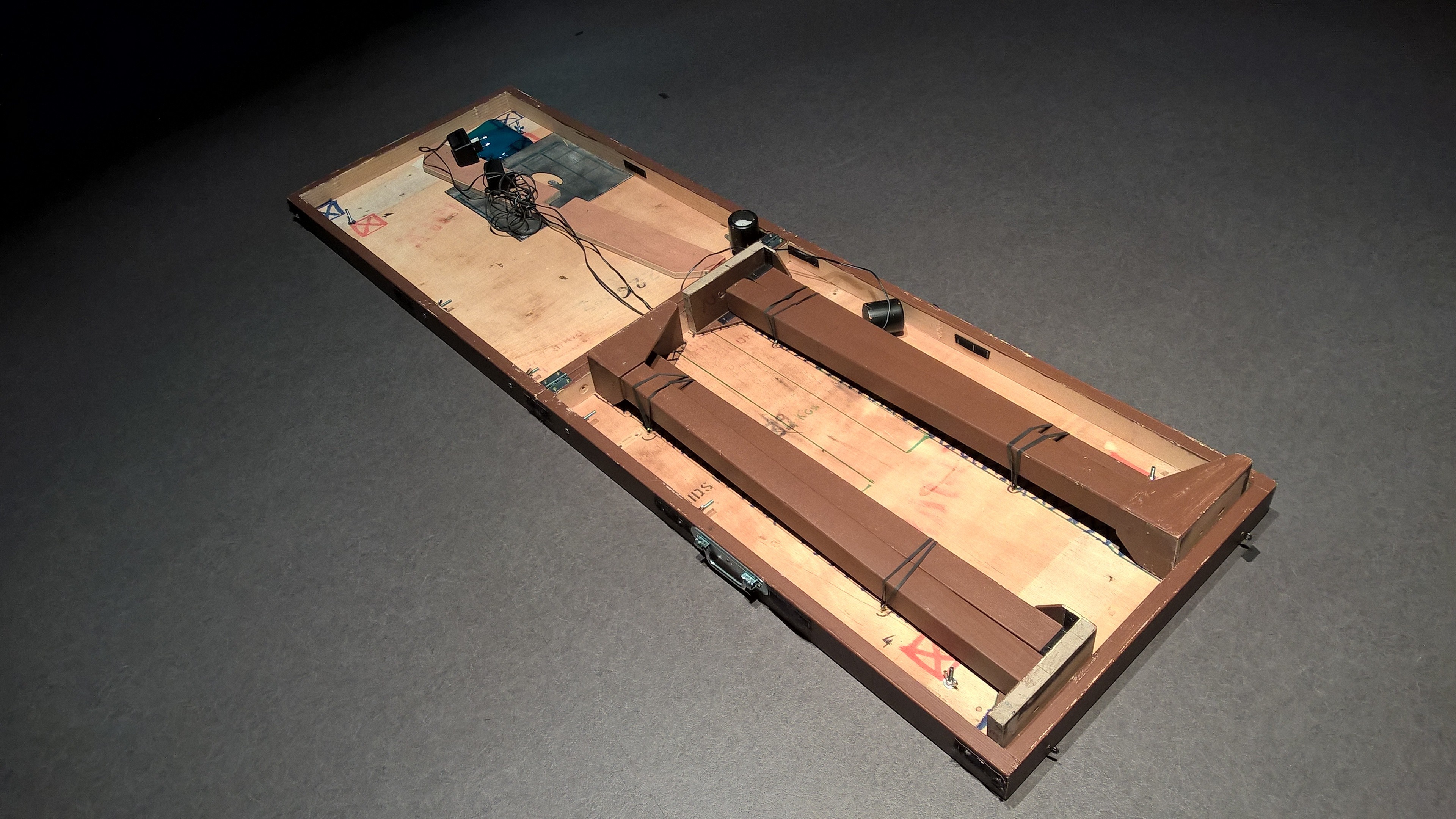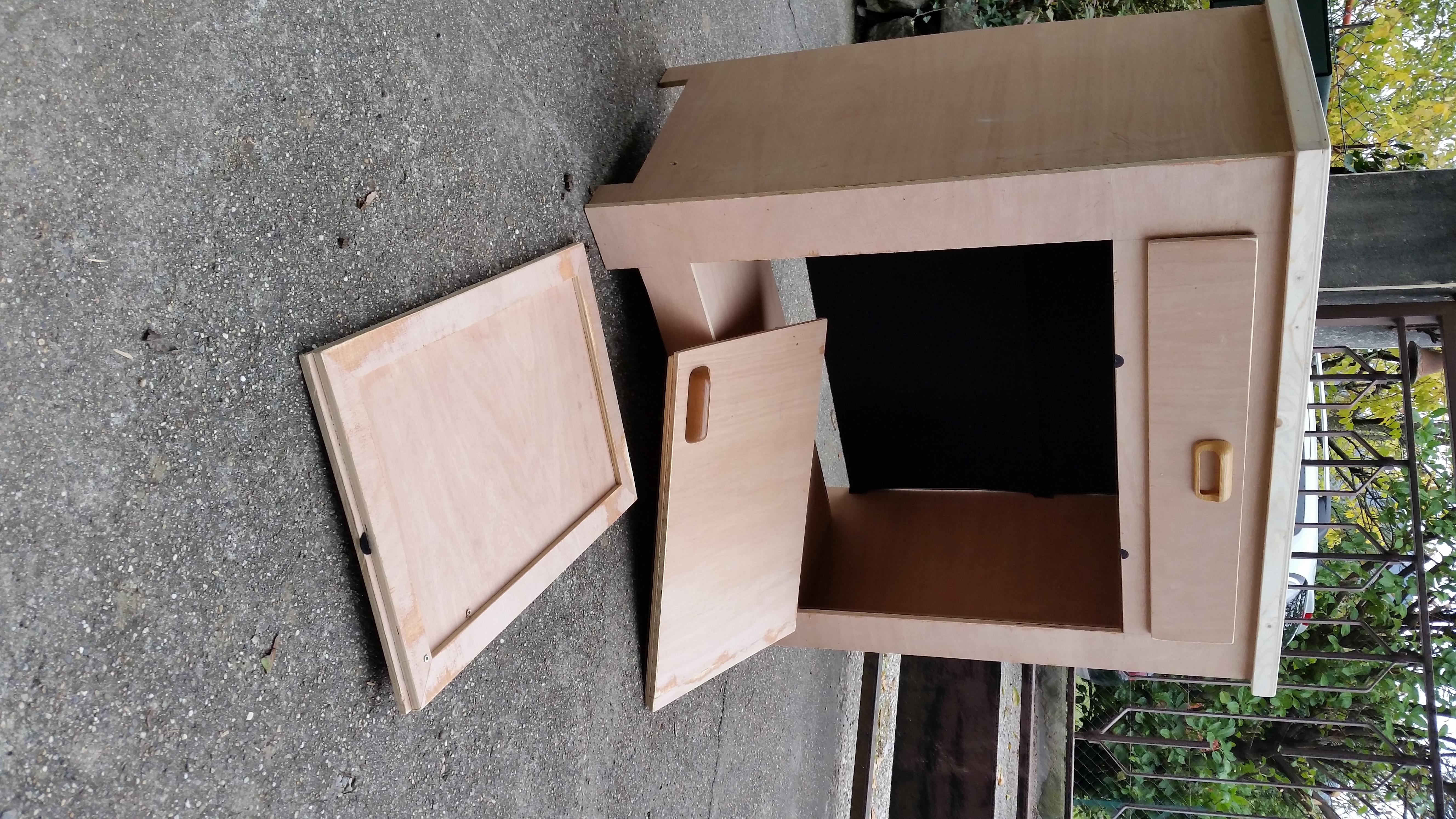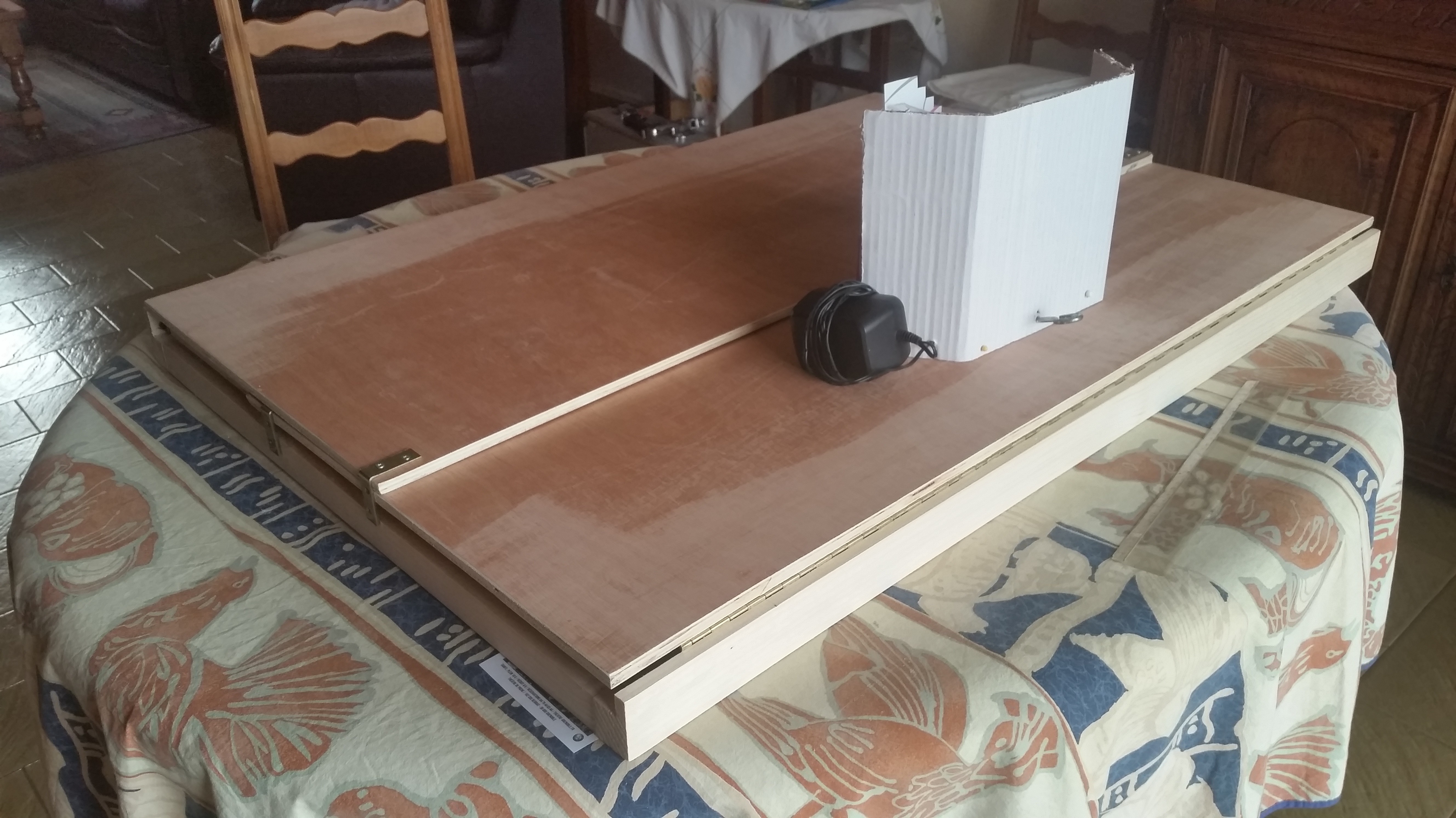 Marionnette Yan. C-dessous Renard. Yan et la rose des sables. Ecran pour ombres chinoises. Démontable. Yan et la rose des sables. Table de scène démontée. Pieds à l’intérieur. Et portée comme une valise.